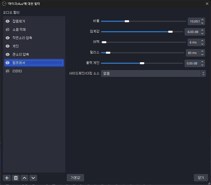 정확한 정보는 OBS Compressor Filter를 참고해주세요.